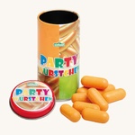 9 mini saucisses en bois pour jouer, livrées dans une boite en métal.