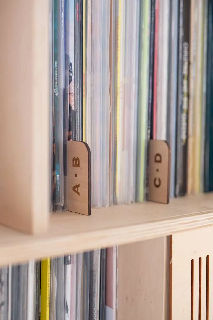 Un lot de 13 intercalaires en bois avec les lettres de l’alphabet gravées sur l’extrémité. Chaque intercalaire étant à glisser entre vos vinyles correspondant aux lettres alphabétiques.