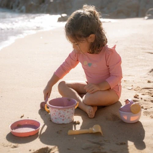 Cet seau en 5 parties Little Dutch Contient toutes les choses dont votre enfant a besoin sur la plage: un seau, un arrosoir, une pelle, un tamis et un râteau.