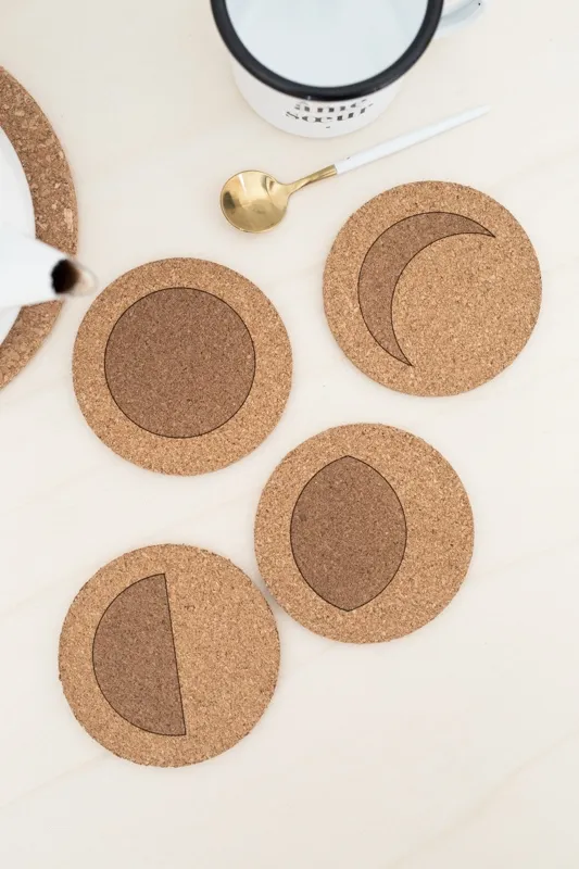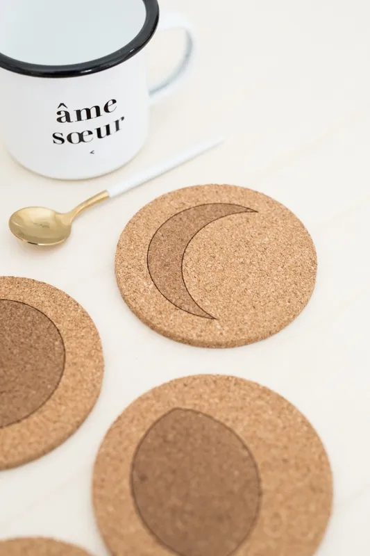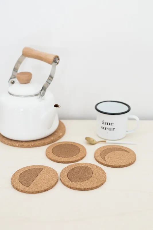 Ce lot de quatre sous-verre en liège gravés des quatre phases de la lune, est à la fois un objet décoratif et pratique !