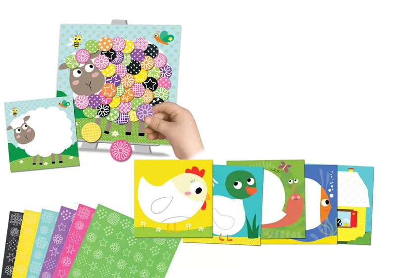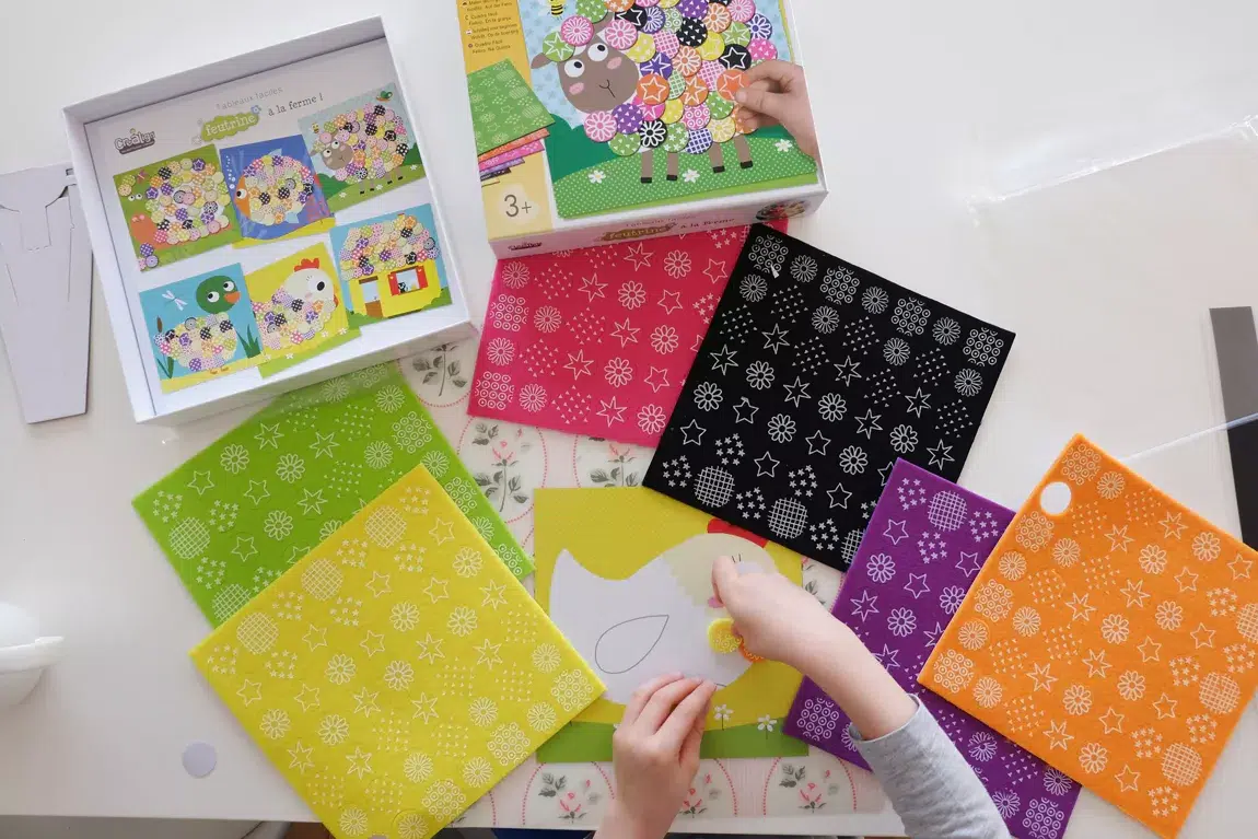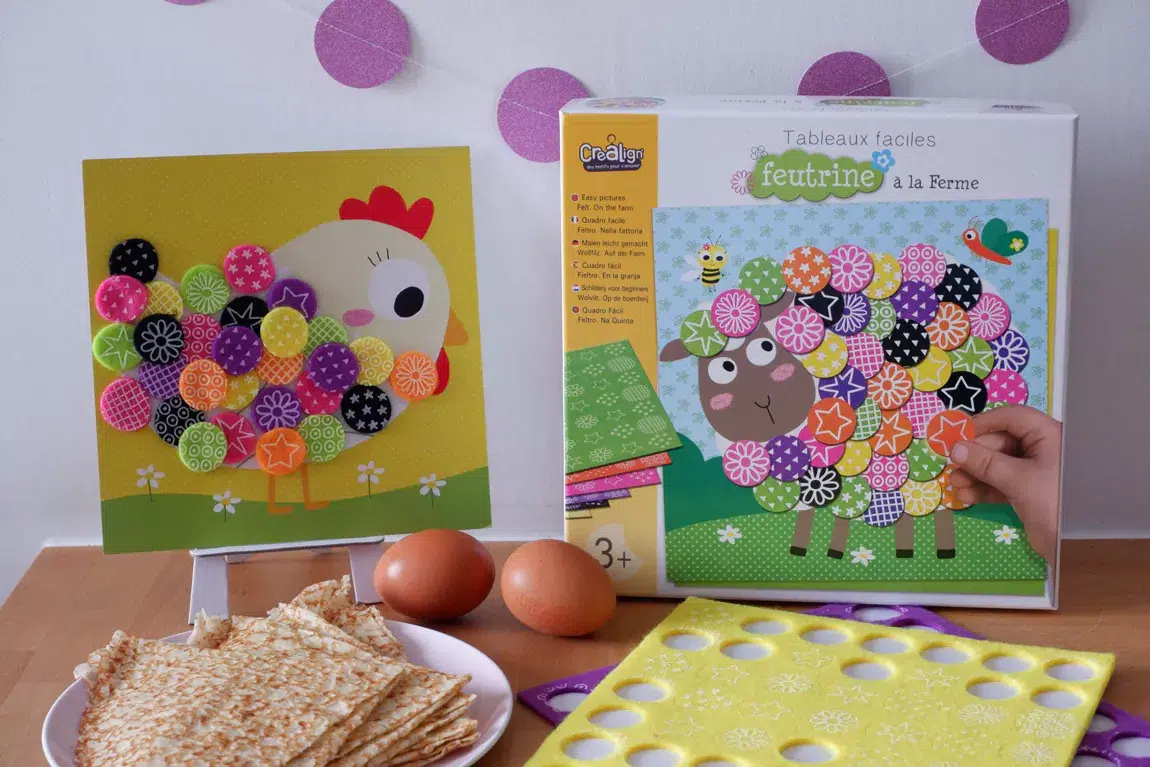 Découvrez le coffret Tableaux de feutrine à la ferme de Créalign’, une activité créative pour les enfants à partir de 3 ans qui vont réaliser 6 tableaux tout doux grâce aux gommettes de feutrine autocollantes.