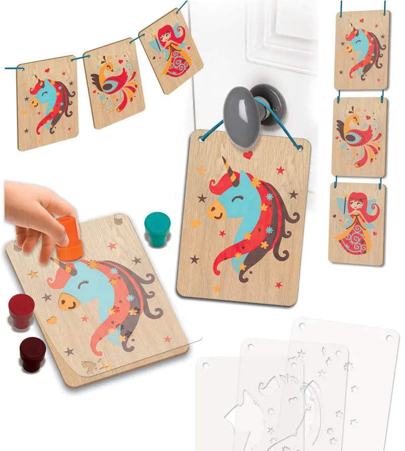 3 planchettes en bois, 3 jeux de pochoirs pour dessiner 3 personnages, 4 applicateurs de couleur et une cordelette