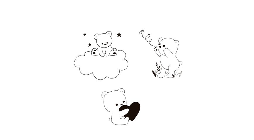 Tatouage éphémère représentant 3 petits dessins d’un ourson : Un sur un nuage, un autre avec un coeur et un autre qui s’amuse.