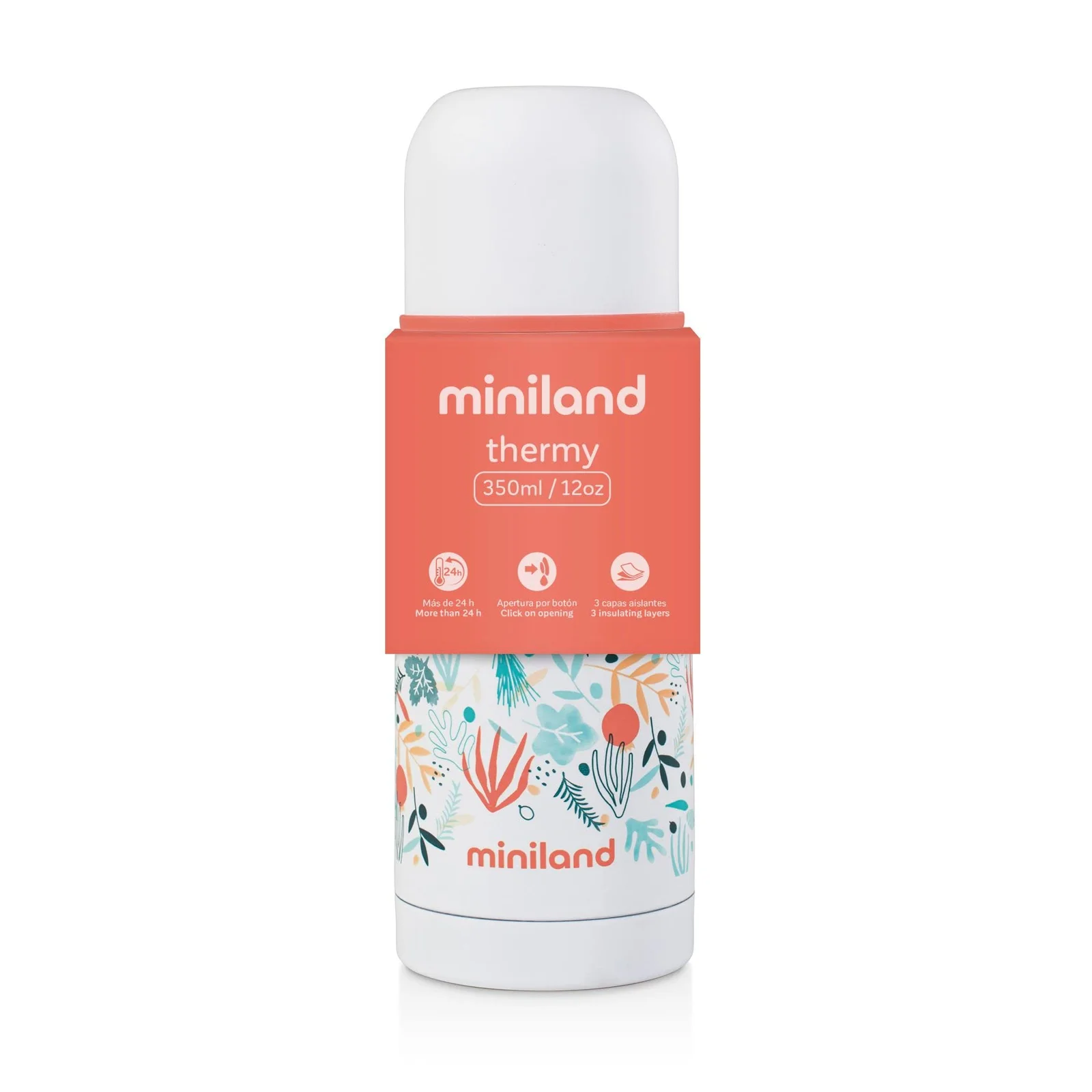 Thermos méditerranéen 350ml Miniland, est extrêmement durable et efficace, avec un double revêtement en acier, une couche d’aluminium, une chambre à vide et un système de double couvercle.