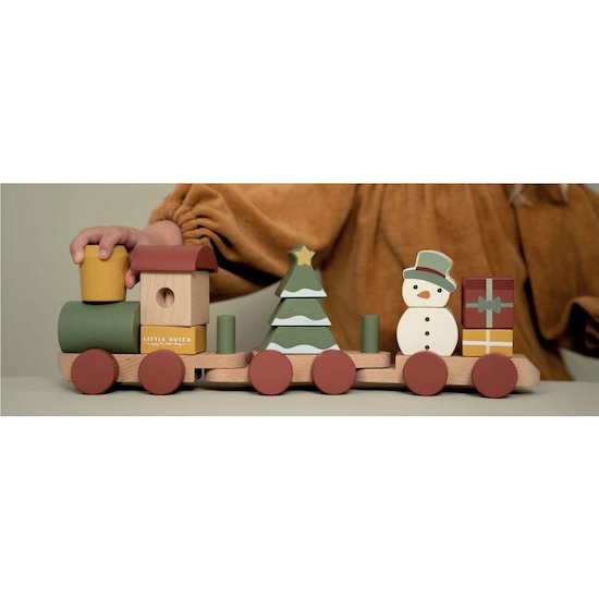Montez à bord du train de Noël ! Aidez-vous à charger les cadeaux ? Le bonhomme de neige est déjà monté. Construisez le sapin de Noël dans le wagon à l’aide des blocs empilables de différentes formes. Le train empilable stimule la coordination œil-main de votre petit et soutient la motricité fine. Le cadeau parfait à mettre sous le sapin, pour jouer pendant les fêtes.