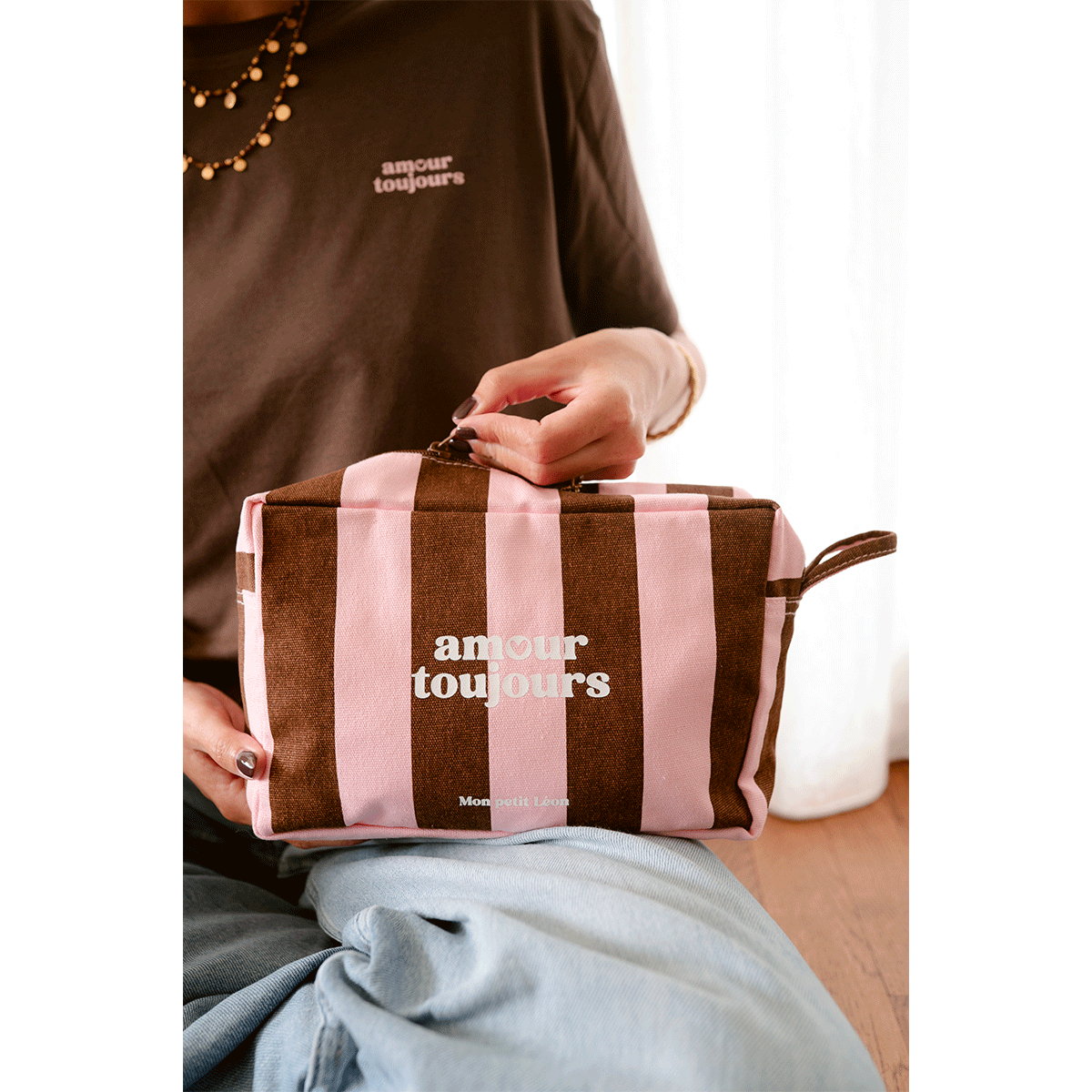Une trousse de toilette en toile de coton épaisse et entièrement doublée en déperlant à l’intérieur.