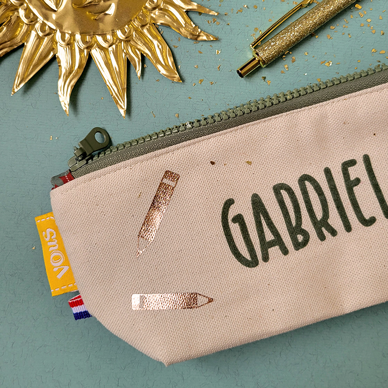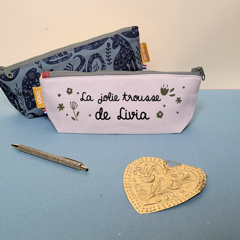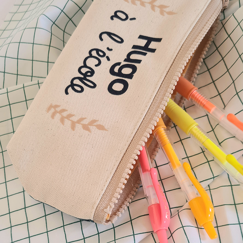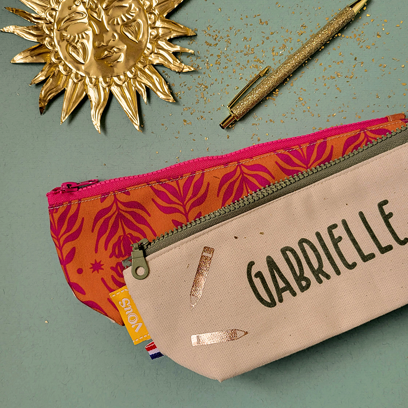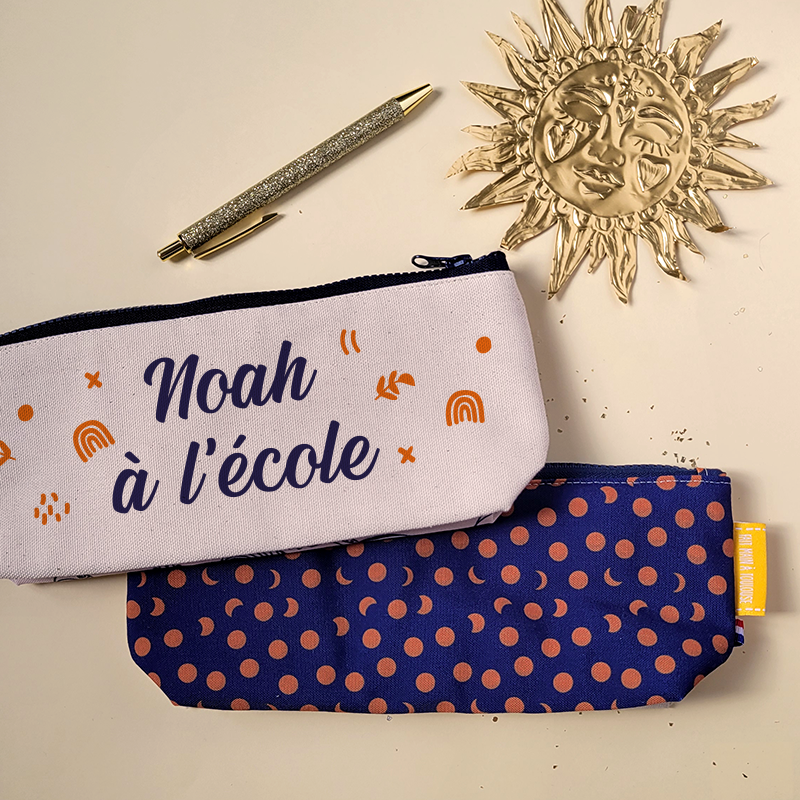 Nouveau format plus grand ! Une face écrue pour personnaliser, l’autre avec un de nos sublimes tissus 😉. Idéale pour y ranger stylos, feutres, gomme, règle… Vraiment douce avec sa doublure molletonnée 100% coton.