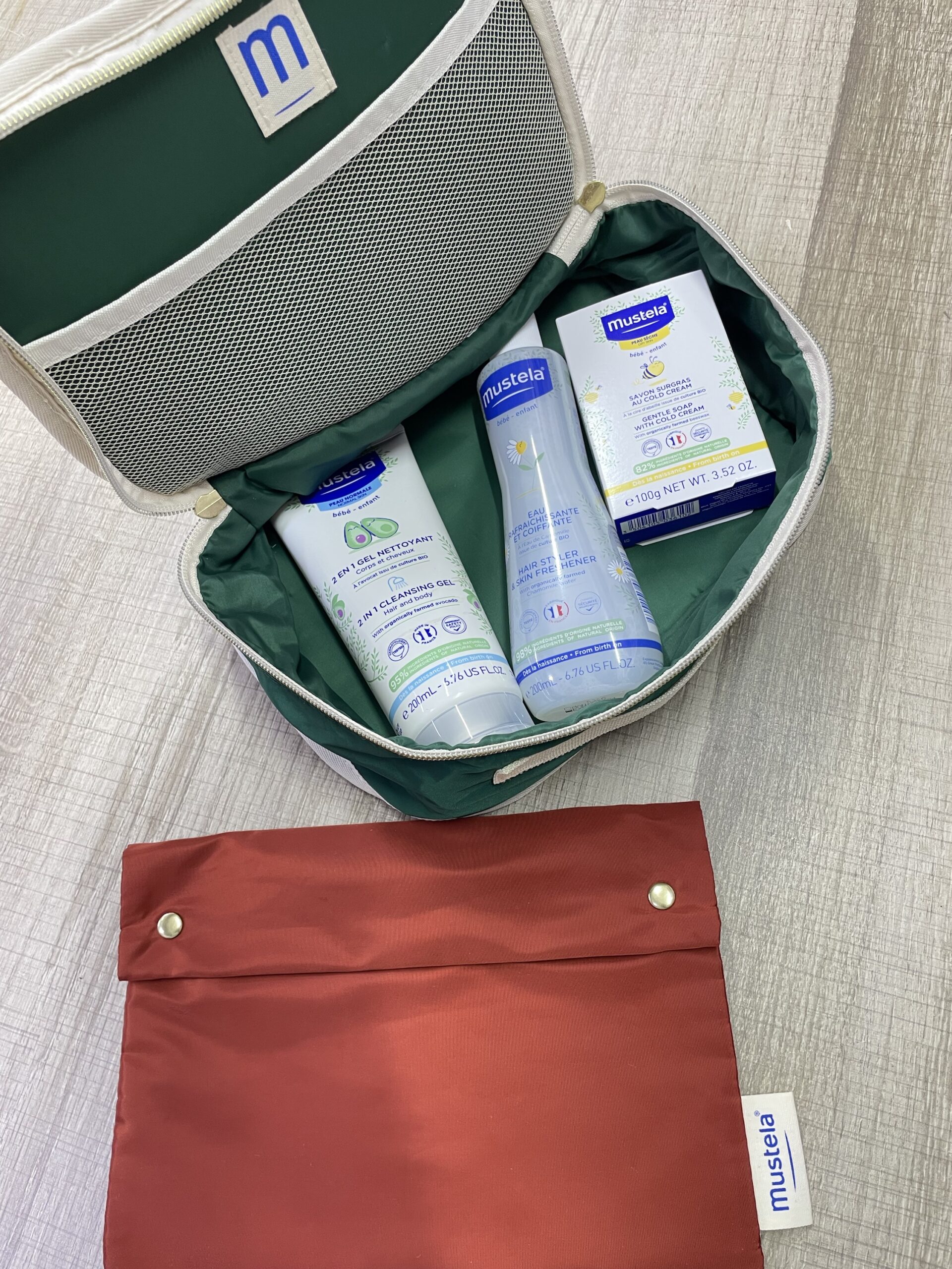 Une trousse Mustela de départ pour les nouveaux nés – Gel nettoyant (corps et cheveux)200ml – eau rafraîchissante 200ml – savon 100g livré avec une trousse offerte 🎁