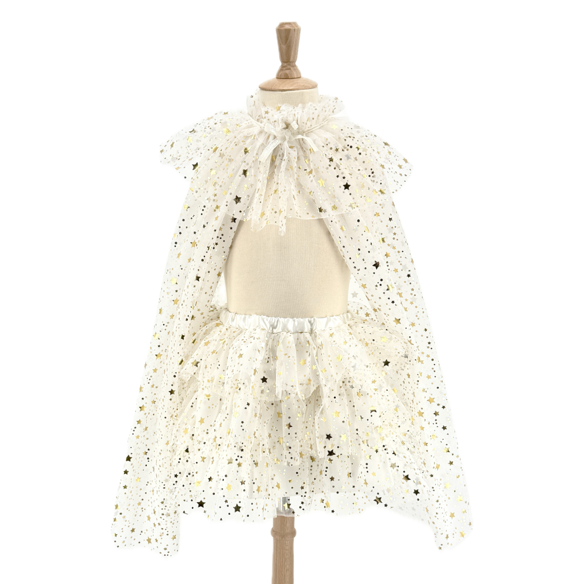 Le set Tutu et Cape Loane couleur Ivoire est composé d’un tutu en tulle avec impression d’étoiles dorées et d’une cape assorties.