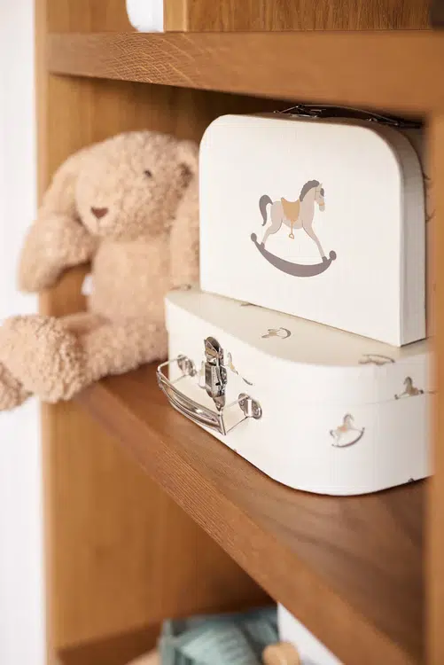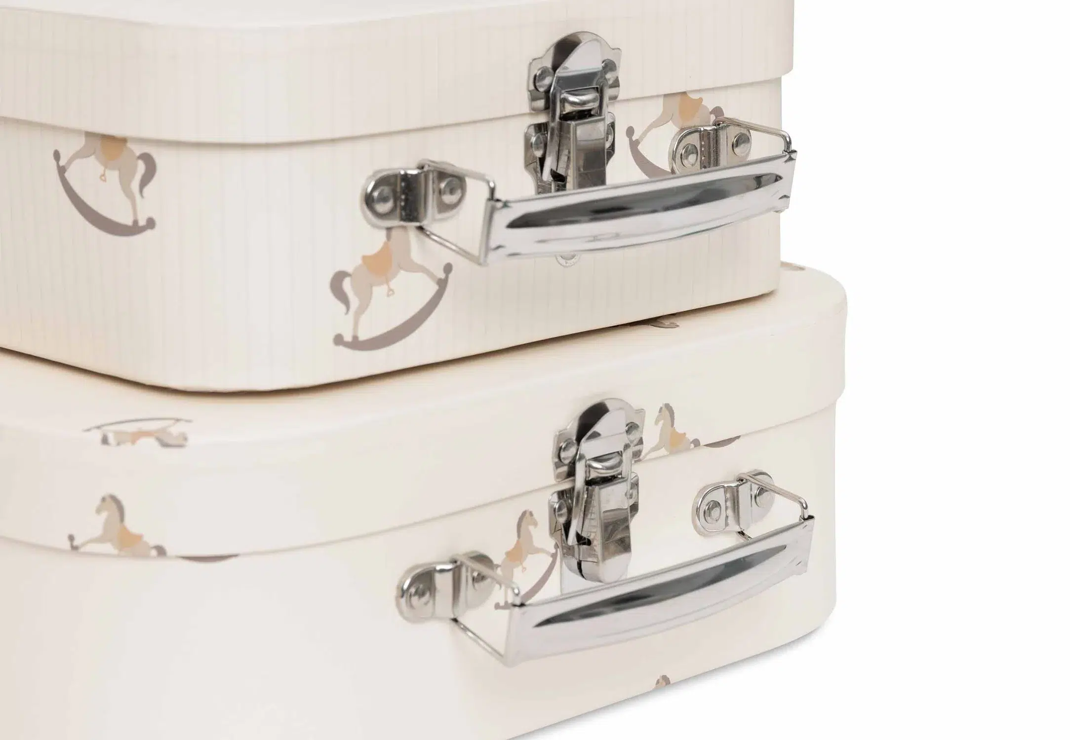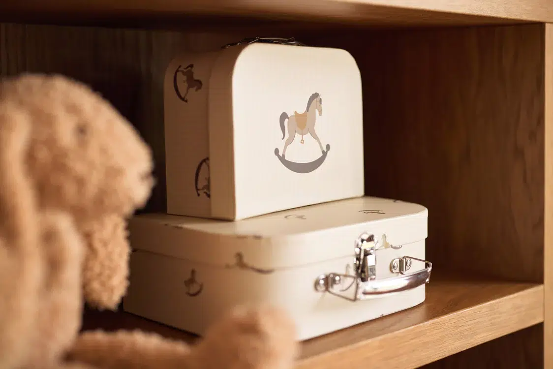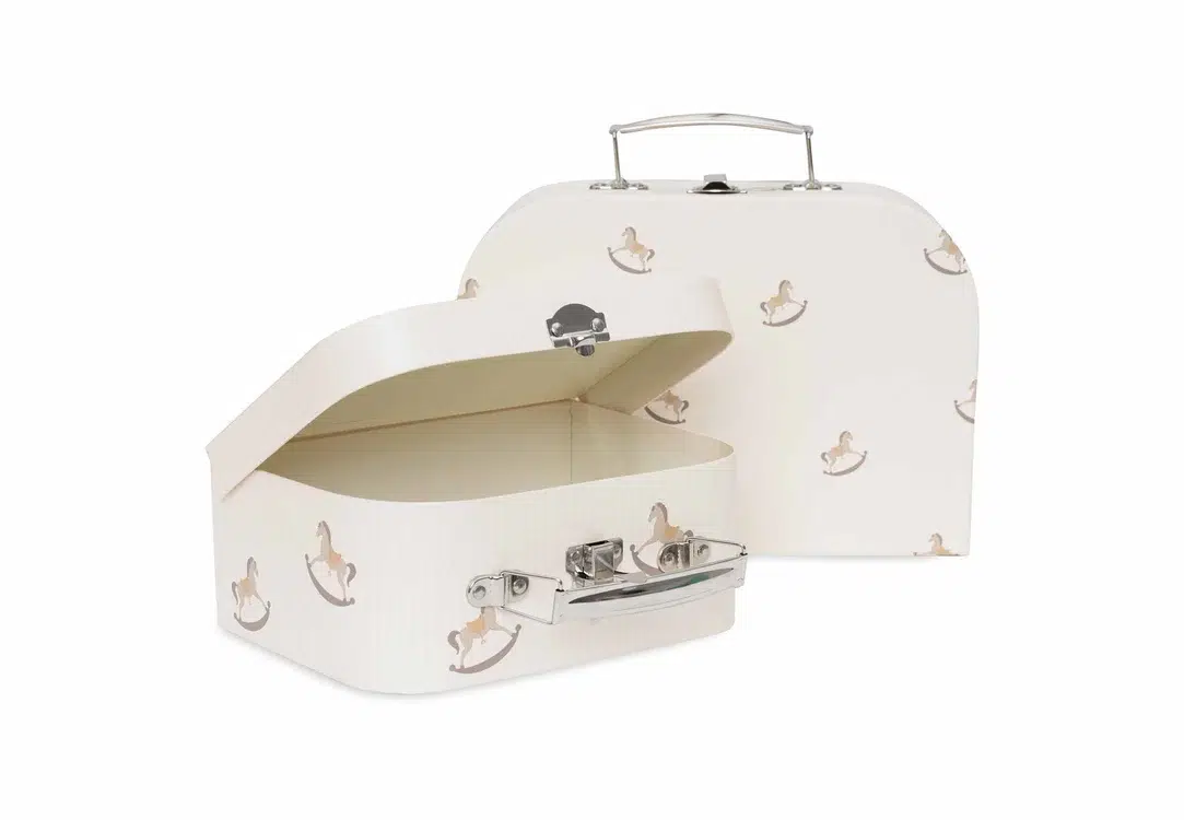 Ce lot de 2 contient 1 grande valisette à jouets avec un imprimé du cheval à bascule et 1 petite valisette avec un imprimé du cheval de notre collection Nostaligic Ride !