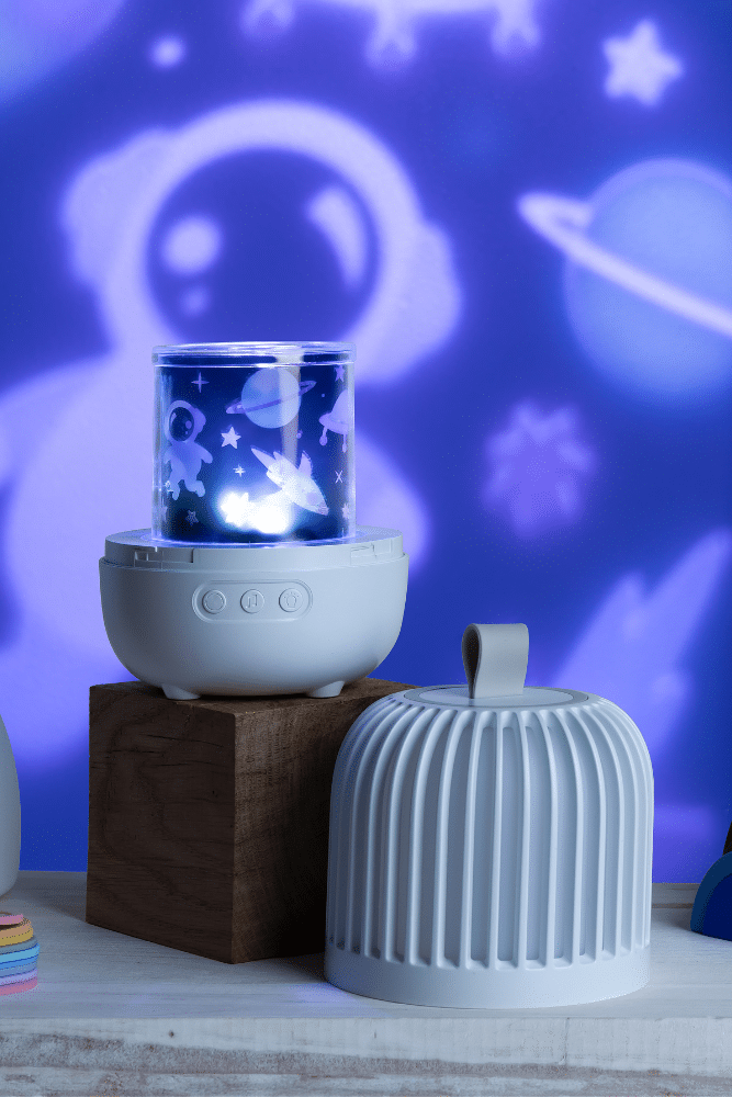 Découvrez Lumi la veilleuse projecteur musical rechargeable avec 3 motifs de projection interchangeables (espace, océan, fleurs) et 8 mélodies différentes.